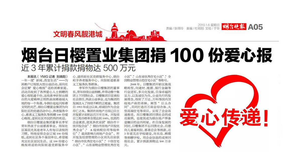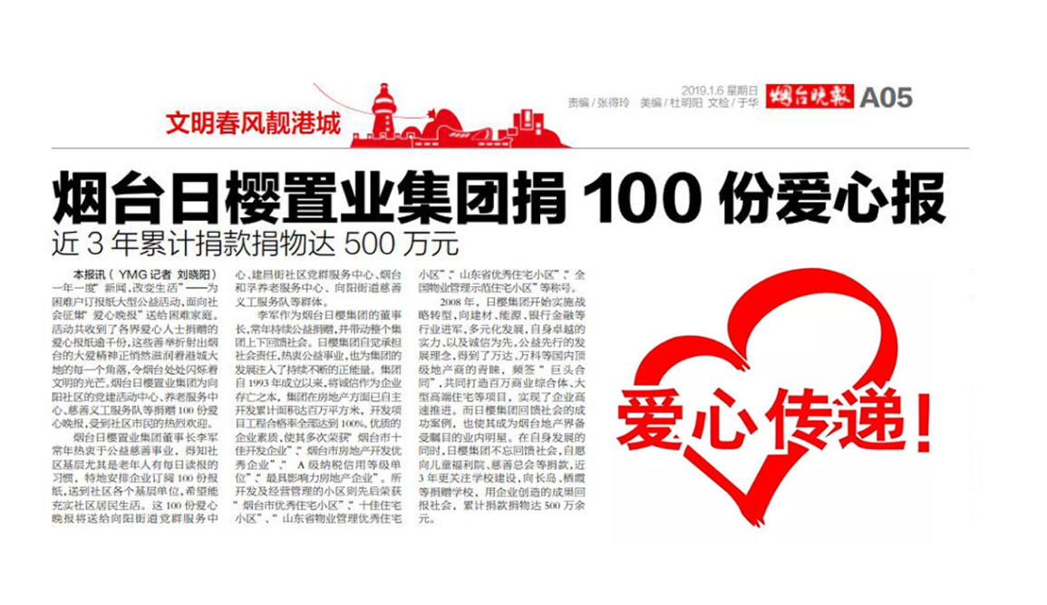 中澤華羿集團(tuán)在自我發(fā)展的同時(shí)“不忘初心、回饋社會(huì)”,集團(tuán)領(lǐng)導(dǎo)及員工曾多次自發(fā)開展各類敬老孝親慈善捐助、春風(fēng)助學(xué)、慈善下鄉(xiāng)等活動(dòng),并第一時(shí)間聯(lián)系煙臺(tái)市社會(huì)福利院、煙臺(tái)市慈善總會(huì)及煙臺(tái)多個(gè)市區(qū)愛心服務(wù)站,送去捐款和捐贈(zèng)物品,多次獲得煙臺(tái)市及各市區(qū)授予的“最具愛心慈善捐贈(zèng)單位”稱號(hào)。